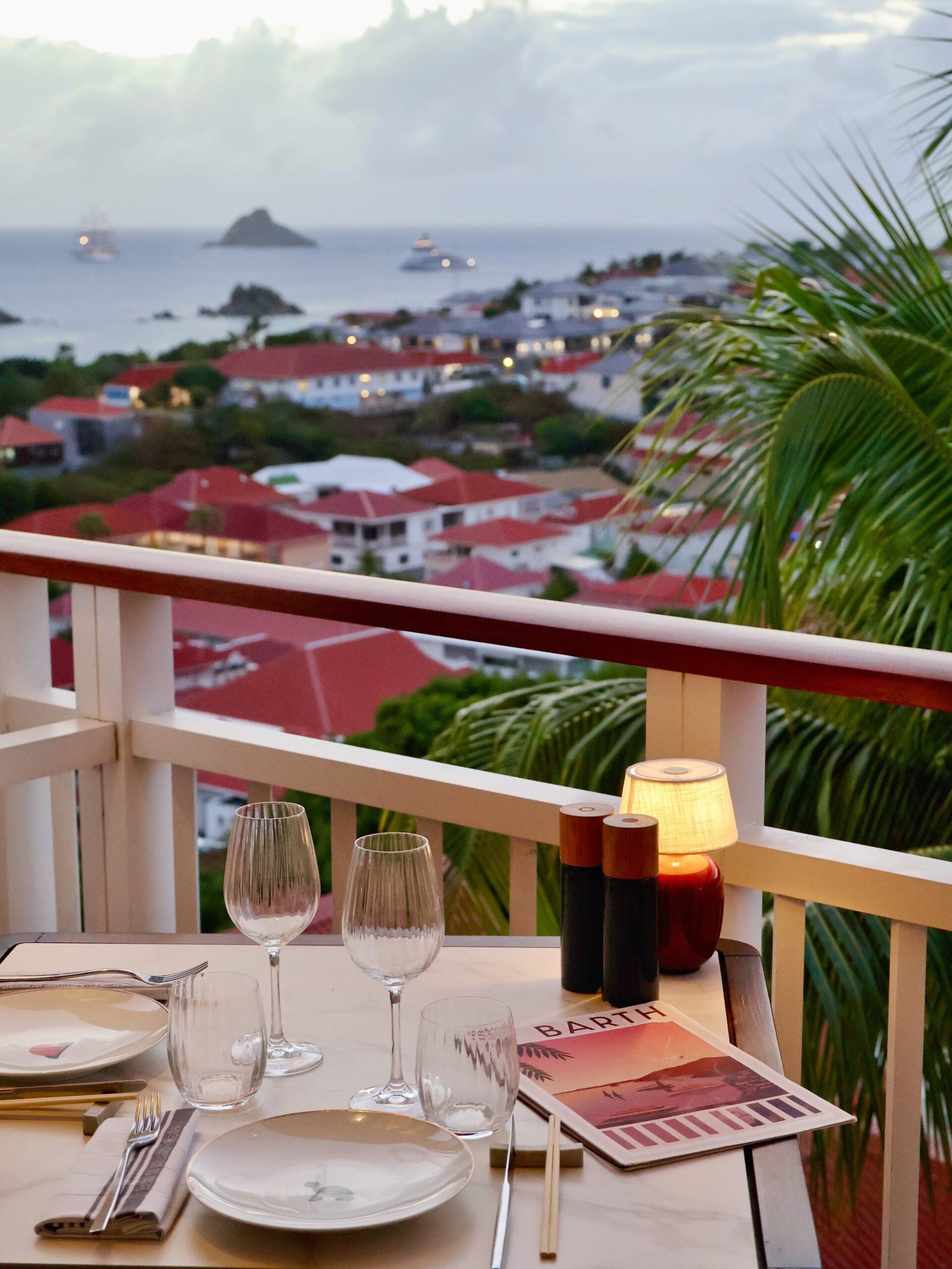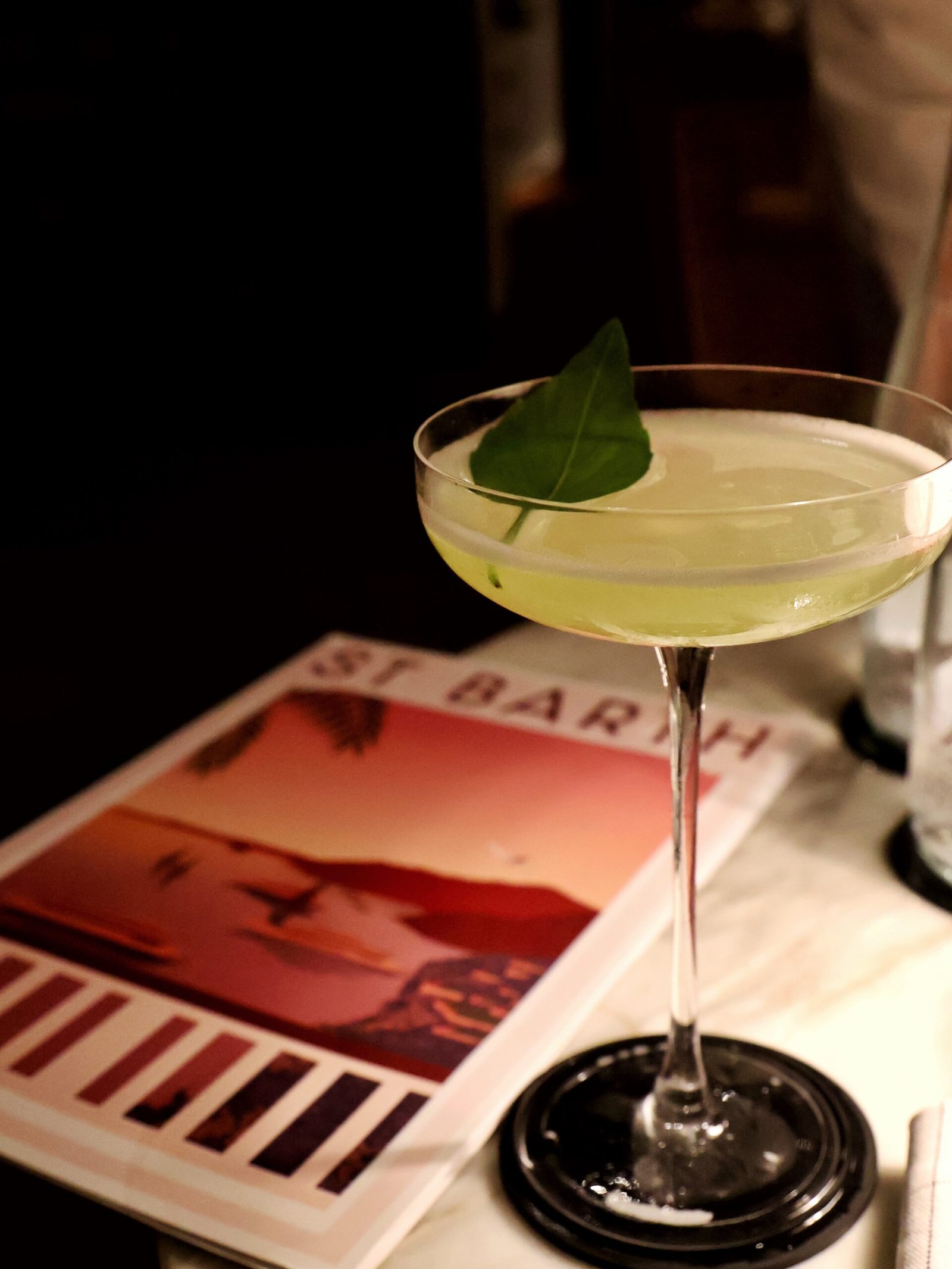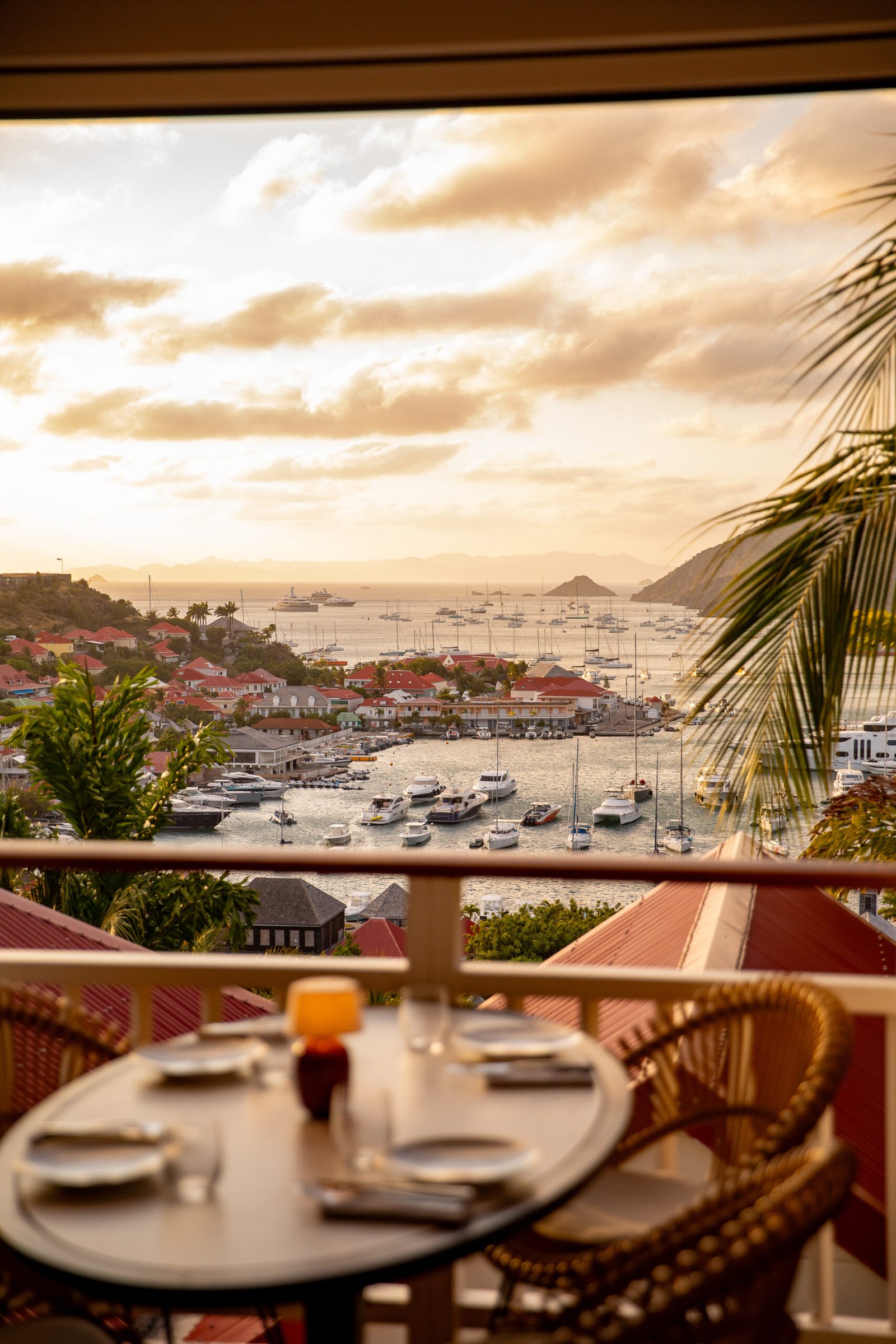 Cocktails signatures, grand choix de vins & champagnes, apéritifs au coucher du soleil face aux voiliers de Gustavia.
