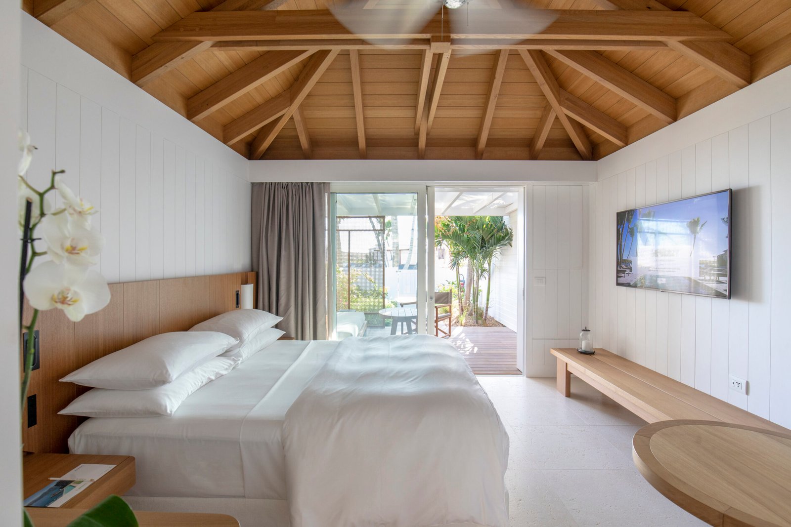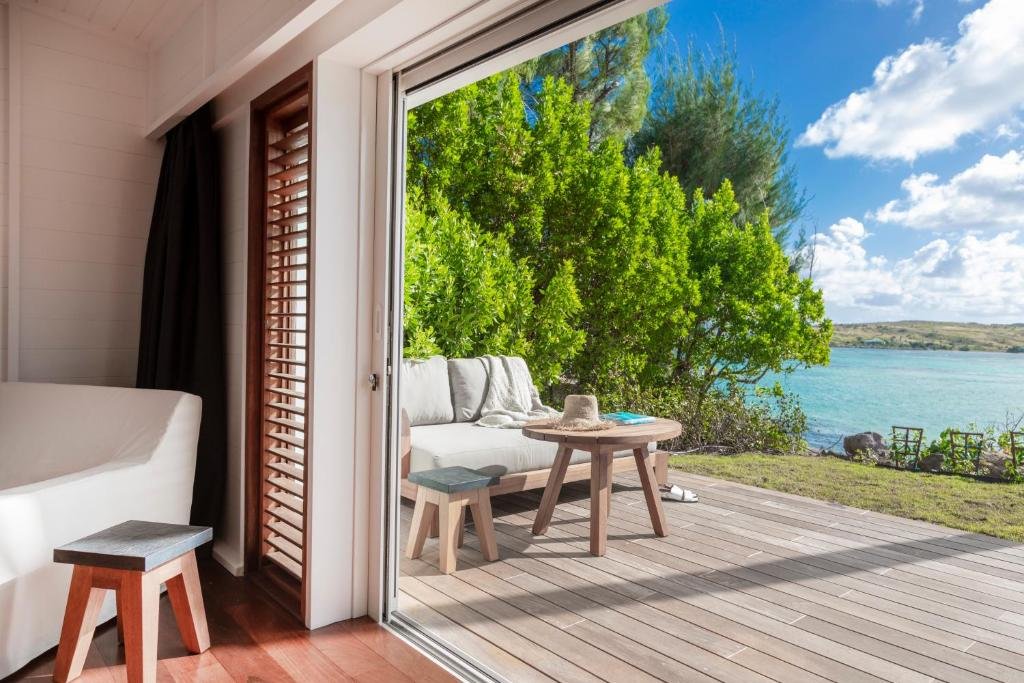 Les suites et villas de l’hôtel Le Sereno reflètent une élégance naturelle et contemporaine : grandes ouvertures sur la mer, mobilier design, tons clairs et terrasses en bois exotique.