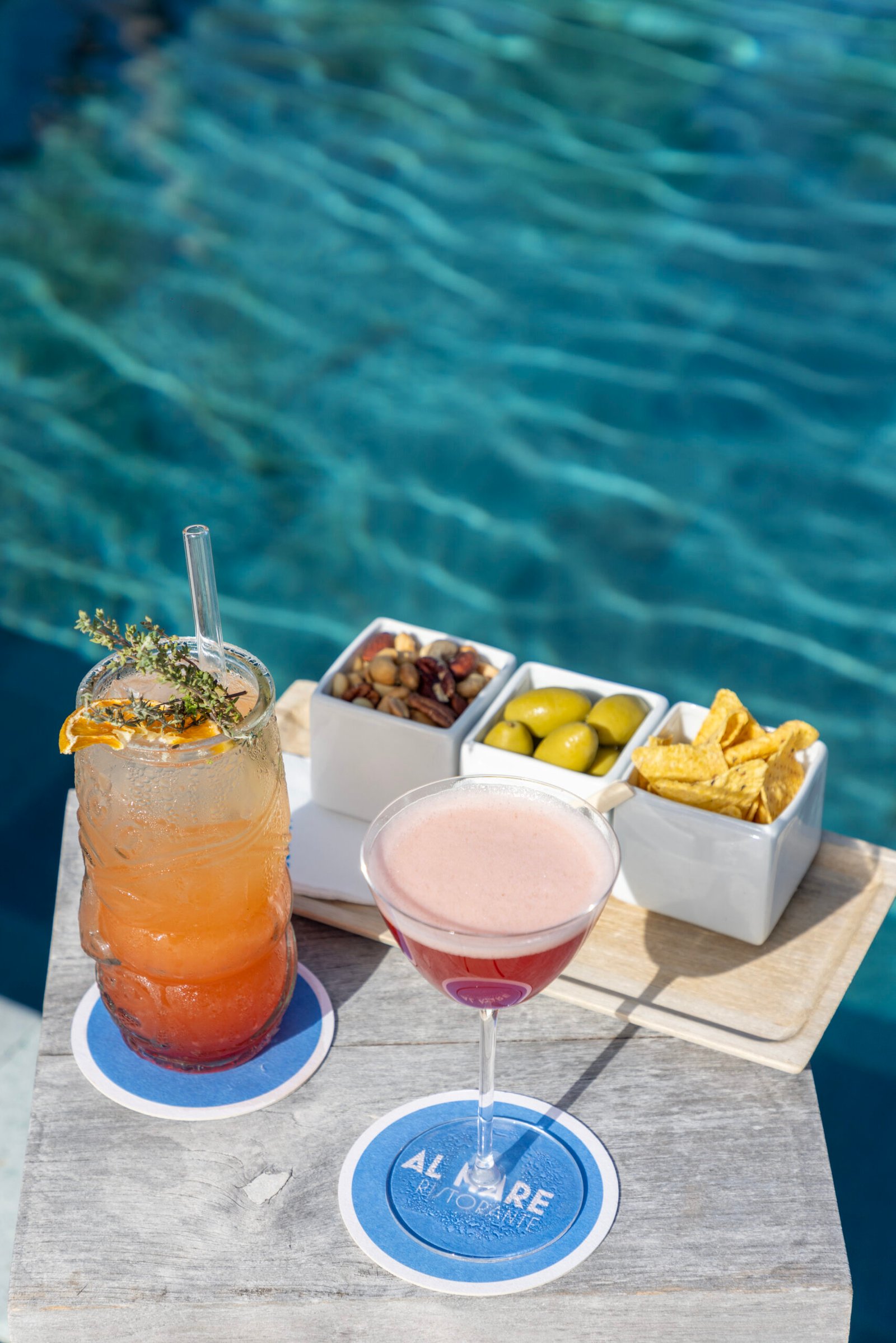 Le bar en bord de mer invite à savourer un cocktail signature ou un verre de vin au coucher du soleil. Atmosphère paisible en journée, plus vibrante à la tombée de la nuit, avec une touche musicale discrète et élégante.
