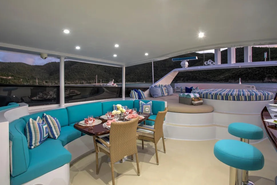 Équipements : Flybridge spacieux, salon intérieur et extérieur, cuisine équipée, bains de soleil, douche de pont, système audio haut de gamme