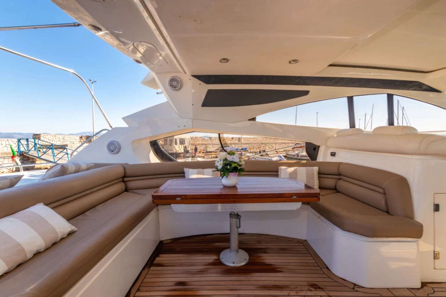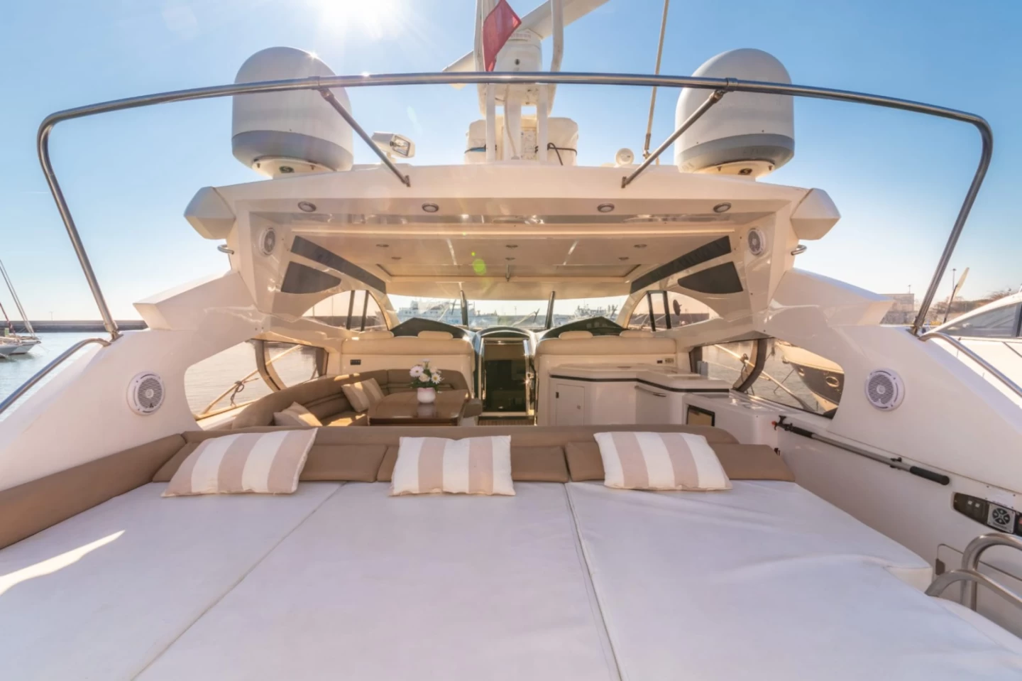 • Équipements : Flybridge, bain de soleil avant/arrière, salon intérieur et extérieur, douche de pont, cuisine équipée, système audio haut de gamme